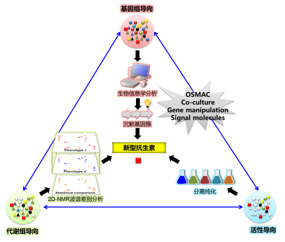 基于多组学技术的海洋放线菌中新型抗生素靶向挖掘研究:通过基因组挖掘(genome mining),OSMAC(one strain many compounds),共培养(co-coculture),信号分子诱导等方法,激活海洋放线菌中的“隐性(cryptic)”次级代谢产物;同时采用LC-MS/2D-NMR代谢组分析技术结合靶向活性追踪策略,迅速获得特定基因簇编码产物的结构新颖性及基因-化合物-活性之间对应关系,从而减少已知化合物的重复分离,高效获得新型抗生素,为海洋微生物来源新一代抗菌药物研发提供先导化合物。
