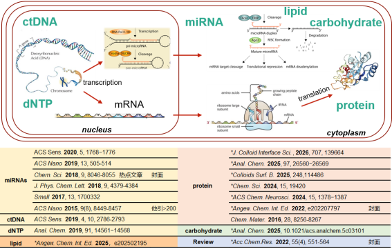 1. M. Zhu; Z. Mao; X. Li; F. Chen; Y. Wang; J. Guo,X. Qiu*. Quantum-Dot-Based Single-Molecule Förster Resonance Energy Transfer for Investigating the Conformations of Tau and Phosphorylated Tau. J. Colloid Interface Sci., 2026, 707, 139664. 2. A. Zhang, X. Mei, Q. Lyu, R. Feng, J. Xu, J. Yan, S. Zhai, N. C. Payne, Y. Wang, R. Mazitschek, Y. Chang*, X. Qiu*. Time-Resolved “Barbecue” Förster Resonance Energy Transfer for Sensitive and Homogenous Detection of Alginate.Anal. Chem., 2025.10.1021/acs.analchem.5c03101 3. H. Liu, Y. Liu, R. Feng, M. Qian, Y. Li, S. Zhai, J. Song, and X. Qiu*. Homogeneous Femtomolar Detection of P‑tau181 via Proximity Extension and CRISPR/Cas Technique.Anal. Chem., 2025.97, 26560−26569 4. J. Yan#, L. Bao#, H. Liang, L. Zhao, M. Liu, L. Kong, X. Fan, C. Liang, T. Liu, X. Han, K. Wang, C. Shen, W. Sun, X. Zhou, B. Chu, M. J. McGlinchey, X. Xu, X. Qiu* and Y. Wang*.A Druglike Ferrostatin-1 Analogue as a Ferroptosis Inhibitor and Photoluminescent Indicator. Angew. Chem. Int. Ed., 2025, e202502195 5. Y. Li#, M. Qian#, Y. Cheng, X. Qiu*. Robust visualization of membrane protein by aptamer mediated proximity ligation assay and Förster resonance energy transfer. Colloids Surf. B.,2025, 248, 114486 6. X. Li, Y. Li, A. Xie, F. Chen, J. Wang, J. Zhou, X. Xu, Z. Xu*, Y. Wang* and X. Qiu*. A potent and selective anti-glutathione peroxidase 4 nanobody as a ferroptosis induce. Chem. Sci., 2024, 15, 19420. 7. Y. Li#, M. Qian#, Y. Liu, X. Qiu*. Sensitive Detection of Exosomal Biomarkers by Aptamer-Mediated Proximity Ligation Assay via Time-Resolved Förster Resonance Energy Transfer. Biosensors, 2024, 14 (5), 233. 8. H. Yu, R. Feng, F. Chen, Z. Wu, D. Li*, and X. Qiu*. Rapid FRET Assay for the Early Detection of Alpha-Synuclein Aggregation in Parkinson’s Disease. ACS Chem. Neurosci., 2024, 15, 1378−1387. 9. R. Su, Y.-T. Wu, S. Doulkeridou, X. Qiu*, T. J. Sørensen, K. Susumu, I.L. Medintz, P. M. P. van Bergen en Henegouwen*, N. Hildebrandt*. A Nanobody-on-Quantum Dot Displacement Assay for Rapid and Sensitive Quantification of the Epidermal Growth Factor Receptor (EGFR).Angew. Chem. Int. Ed., 2022, 61(33), e202207797 10. X. Qiu*, J. Xu, M. Cardoso Dos Santos, N. Hildebrandt*. Multiplexed Biosensing and Bioimaging Using Lanthanide-Based Time-Gated Förster Resonance Energy Transfer, Acc.Chem.Res., 2022, 55(4), 551-564.封面 11. J. Xu, J. Guo, N. Golob-Schwarzl, J. Haybaeck, X. Qiu* and N. Hildebrandt*. Single-Measurement Multiplexed Quantification of MicroRNAs from Human Tissue Using Catalytic Hairpin Assembly and Förster Resonance Energy Transfer. ACS Sens., 2020, 5, 1768−1776. 12. X. Qiu*, O. Guittet, C. Mingoes, N. E. Banna, M.-E. Huang, M. Lepoivre*, and N. Hildebrandt*. Quantification of Cellular Deoxyribonucleoside Triphosphates by Rolling Circle Amplification and Förster Resonance Energy Transfer. Anal. Chem., 2019, 91, 14561−14568. 13. M. Dekaliuk, X. Qiu*, F. Troalen, P. Busson, and N. Hildebrandt*. Discrimination of the V600E Mutation in BRAF by Rolling Circle Amplification and Förster Resonance Energy Transfer. ACS Sens., 2019, 4, 10, 2786-2793. 14. J. Guo#, X. Qiu#, C. Mingoes, J.R. Deschamps, K. Susumu, I.L. Medintz, and N. Hildebrandt*. Conformational Details of Quantum Dot-DNA Resolved by Förster Resonance Energy Transfer Lifetime Nanoruler. ACS Nano, 2019, 13, 505-514. 15. X. Qiu, J. Xu, J. Guo, A. Yahia-Ammar, N.-I. Kapetanakis, I. Duroux-Richard, J.J. Unterluggauer, N. Golob-Schwarzl, C. Regeard, C. Uzan, S. Gouy, M. DuBow, J. Haybaeck, F. Apparailly, P. Busson, and N. Hildebrandt*. Advanced microRNA-based cancer diagnostics using amplified time-gated FRET. Chem. Sci., 2018, 9, 8046-8055.封面和2018 Chemical Science热点文章 16. X. Qiu#, J. Guo#, J. Xu, and N. Hildebrandt*. Three-Dimensional FRET Multiplexing for DNA Quantification with Attomolar Detection Limits. J. Phys. Chem. Lett., 2018, 9, 4379−4384. 17. X. Qiu, J. Guo, Z. Jin, I. L. Medintz, N. Hildebrandt*. Multiplexed Nucleic Acid Hybridization Assays Using Single-FRET-Pair Distance-Tuning. Small, 2017, 13, 1700332. 18. X. Qiu, K. D. Wegner, Y.T. Wu, P. M.P. van Bergen en Henegouwen, T. L. Jennings, and N. Hildebrandt*. Nanobodies and Antibodies for Duplexed EGFR/HER2 Immunoassays Using Terbium-to-Quantum Dot FRET. Chem. Mater., 2016, 28, 8256-8267.封面 19. X. Qiu and N. Hildebrandt*. Rapid and Multiplexed MicroRNA Diagnostic Assay Using Quantum Dot-Based Förster Resonance Energy Transfer. ACS Nano, 2015, 9(8), 8449-8457. 引用200次 | ||||||