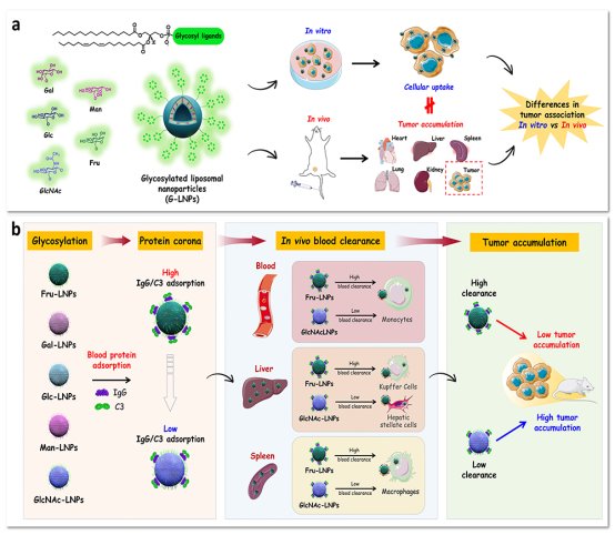 糖类分子是生命体系中重要的生物识别信息之一。细胞表面的“糖萼”由大量糖蛋白和糖脂组成,在细胞识别、黏附、免疫调控以及信号传递等生命过程中发挥关键作用。受天然糖萼结构与功能的启发,在纳米药物表面引入糖基配体以模拟糖萼功能,已成为近年来提升纳米药物靶向递送能力的重要策略。然而,新型糖基化磷脂材料的精准、高效和规模化制备仍面临结构可控性、合成效率等诸多挑战;与此同时,表面糖结构如何调控纳米药物与血液蛋白、免疫细胞等生物分子和生物界面的相互作用,并进一步影响其体内分布与清除行为,目前仍缺乏系统认识。