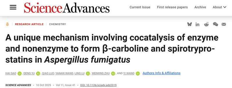 近日,中国海洋大学医药学院、青岛海洋科技中心海洋药物与生物制品实验室、海洋药物教育部重点实验室王乂&朱伟明教授团队,在国际知名学术期刊Science Advances在线发表题为《A unique mechanism involving cocatalysis of enzyme and nonenzyme to form β-carboline and spirotryprostatins in Aspergillus fumigatus(烟曲霉中一种酶–非酶协同催化形成β-carboline和spirotryprostatins类化合物的独特机制)》的研究文章(Sci. Adv. 2025, 11, eadz2319)。该研究首次揭示了pH胁迫下真菌吲哚生物碱骨架“酶—非酶”协同催化新机制,为天然产物高效发现与药物先导化合物的挖掘提供了新思路。