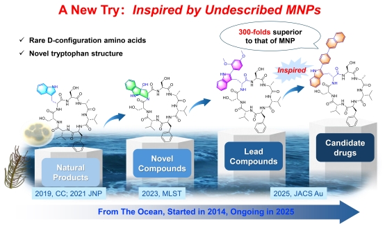 近年来,邵长伦教授研究团队针对国家开发重大创新药物战略需求,依据海洋生物化学防御策略,探索性开展了海洋生态化学防御驱动的海洋创新药物研究。在海洋来源抗结核肽类先导化合物发现与优化方面取得了系列研究成果(Chem. Commun. 2019, 55, 1104; J. Nat. Prod. 2021, 84, 11; Mar. Life Sci. & Tech. 2023, 5, 85; JACS Au 2025, 5, 4982),为抗结核海洋药物先导化合物开发提供了具有重要前景的实体分子(图3)。