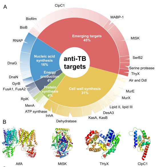 图2. 抗结核天然产物的靶点分布与相应靶点蛋白结构