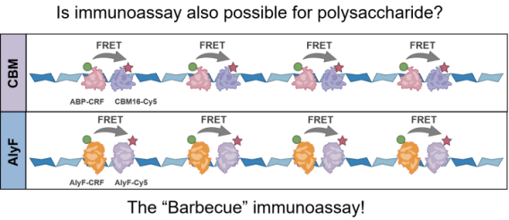 蛋白和核酸生物传感领域的快速发展得益于高特异性的分子识别体系(如针对蛋白的特异性抗体或核酸适配体以及针对核酸的互补杂交序列)。糖类物质作为生物体内另一类至关重要的生物大分子,其研究发展却受到多重制约。这既源于其自身缺乏模板编码机制和高度复杂的结构,也受限于现有的鉴定、解析与定量技术。目前,特异性糖分子识别主要依赖凝集素与有限的糖特异性抗体,这一局限严重制约了相关生物传感策略在糖生物学中的广泛应用。针对以上问题,邱雪团队与中国海洋大学食品科学与工程学院常耀光教授团队和海洋生命学院律倩倩副教授合作,挖掘和利用自然界在长期进化中已经存在的碳水化合物活性酶(carbohydrate-active enzymes, CAZymes)或其糖结合模块(carbohydrate-binding modules, CBMs)作为多糖的高特异性识别元件,创新性地结合时间分辨荧光共振能量转移技术(TR-FRET),实现了多糖的均相“类免疫”荧光分析,研究成果以“Time-Resolved ‘Barbecue’ Förster Resonance Energy Transfer for Sensitive and Homogenous Detection of Alginate”为题发表在《Analytical Chemistry》。团队以海藻酸钠为待测多糖模型分子,利用催化失活的海藻酸裂解酶(AlyF)或其碳水化合物结合模块对海藻酸钠的高特异识别特性,分别对其标记FRET供受体制备海藻酸钠荧光探针,该探针以新式的“烤串”结构随机结合在具有线性重复骨架的海藻酸钠分子上。在适当的探针/海藻酸钠浓度比例下,FRET供受体距离接近并产生FRET信号。本研究采用镧系配合物作为荧光供体,利用其长寿命发光特性有效滤除生物样本中短寿命背景荧光干扰。相较于传统多糖分析方法的复杂前处理流程与检测时长,该方法仅需将待测样品与探针共孵育,无需任何洗涤步骤,30分钟即可完成检测,检测限低至0.4 ng·mL⁻¹。方法在复杂生物样本基质(如胎牛血清、乳制品、护肤品)中检测性能优异,具有良好的抗干扰能力和实际应用潜力。至此,研究团队建立了蛋白、核酸及多糖等生物大分子的系统性分析平台,通过模块化FRET探针设计与信号转导机制融合创新,实现了跨分子类别的均相FRET荧光定量检测。团队未来将继续拓展糖特异性识别元件的开发和应用,通过偶联邻近化学信号转导机制和核酸扩增技术进一步提高糖类物质检测的灵敏度,推动其体内痕量分析技术的发展。