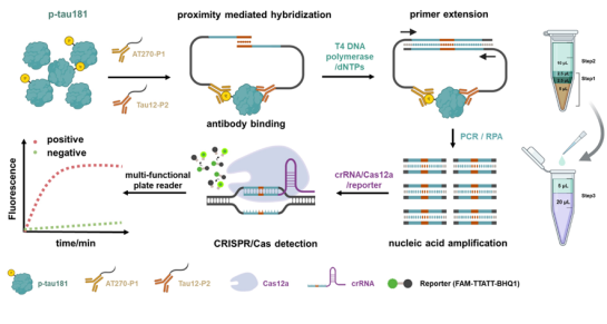 图1. 基于PEA–RPA–CRISPR/Cas技术的p-tau181检测原理与分析流程示意图