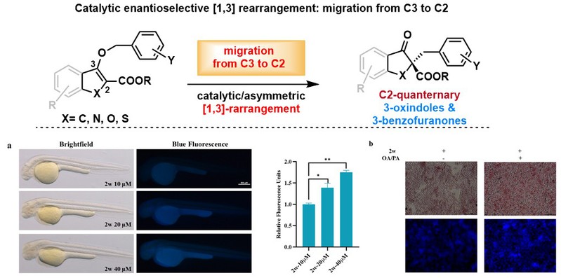 研究发现其中化合物2w可作为荧光探针,用于斑马鱼模型中的脂质可视化标记。卢玲教授课题组以斑马鱼为模型进行荧光探针实验。在斑马鱼模型中,2w能特异性标记受精后28小时(hpf)斑马鱼卵黄中的脂质,且荧光强度呈浓度依赖性增强,在40 μM时达到峰值。为了进一步验证2w具有亲脂性染色脂质,用OA/PA诱导HepG2细胞脂肪变性,在荧光显微镜下观察,2w使脂肪变性的HepG2细胞蓝色荧光增强。这些发现凸显了所合成化合物在未来研究开发中具有广阔的应用潜力。