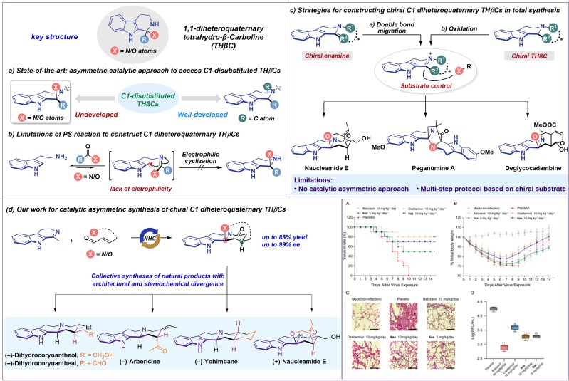 2013年-2023年FDA批准的新小分子药物中,手性药物占比64%,氮杂环药物的比例为82%,其在新药研发中的重要地位不断提升。在氮杂环化合物的合成中,手性氮杂环的合成更具挑战性。1,1-二取代四氢-β-咔啉(THβC)骨架,作为一类结构独特、生物活性多样的优势骨架备受关注。其中,含有C1双杂原子季碳中心的THβC,广泛存在于多种具有重要生理活性的生物碱与药物分子中,尽管C1双碳季碳中心的催化不对称构建已相对成熟,针对C1双杂原子(如O、N等)季碳中心的催化不对称合成,却一直是合成领域的主要难点。传统的Pictet-Spengler反应等经典方法,在面对杂原子取代的羰基底物时,往往因形成的中间体亲电性不足,难以完成关键的环化步骤,导致此类结构的不对称构建仍存在较大挑战。因此,发展高效、高选择性的催化不对称方法,实现C1-双杂季碳中心的精准构建,已成为推动相关天然产物合成与药物分子开发的关键瓶颈之一。研究团队发展了一种催化不对称构建手性C1双杂原子季碳中心四氢-β-咔啉(THβC)的方法,并成功将其应用于多个复杂吲哚生物碱的集群式合成,同时发现了此类结构具有靶向流感病毒NS1蛋白的优异抗病毒活性(图1)。