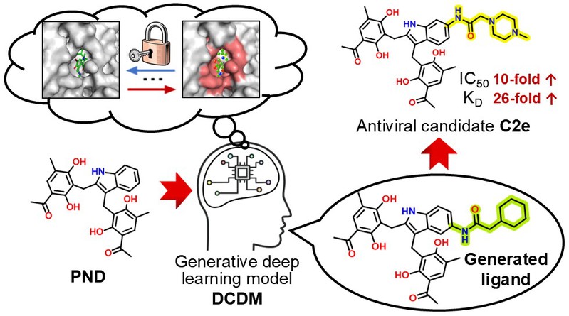 进而利用DCDM模型对前期发现的抗流感先导化合物PND进行了优化。PND是团队从南极海洋真菌中发现的新结构代谢产物,其靶向甲型流感血凝素(HA)蛋白发挥抗病毒作用(J. Med. Chem.2020, 63, 6924.)。团队前期通过分子对接及传统药物化学策略设计合成60余个新型衍生物(Eur. J. Med. Chem. 2023, 258, 115615.),初步探讨了其构效关系。后续深入研究发现PND潜在结合位点较浅且柔性较大,运用传统策略的优化效率较低。因此本研究中团队运用DCDM模型进行新一代PND结构优化工作。通过DCDM固定位点生成了11,000余个新分子,经QED、SA和Vina Dock打分筛选得到502个新分子,最后经目视检查最终选择合成3类结构多样的化合物,包括苯衍生物、醚类/酰胺类化合物,其连接长度不同表明其在结合口袋中可能占据不同的空间区域。经DCDM推荐合成的3个新型衍生物对HA蛋白的亲和力及均有不同程度的提升。进一步进行结构优化共合成5个衍生物,从中得到最优候选化合物C2e,其对HA蛋白的亲和力提高至约为母体化合物PND的26倍,体外抗病毒IC50约为PND的10倍。进一步药理学研究表明,C2e具有广谱抗甲型流感病毒活性,且能够抑制HA介导的合胞体形成。内体实验表明,C2e能够起到保护感染H1N1小鼠的作用,效果几乎与巴洛沙韦相当,且显著高于PND。初步毒性实验与药代动力学实验证明其具有良好的成药潜力。本研究结合DCDM模型仅合成8个新型衍生分子便可获得优于先导的化合物C2e,药物发现效率提升,验证了DCDM生成模型在加速真实世界药物开发方面的实用价值,为人工智能驱动的新药发现提供了新范式(图3)。